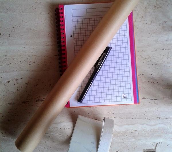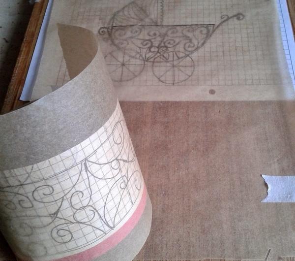 5. Pod papier podkładamy nasz szkic. Nie zapominajmy, że wózek jest 3D - więc oprócz boków potrzebne jest też "dno". Uzyskałam je nawijając papier do pieczenia na rolkę szerokiej taśmy.