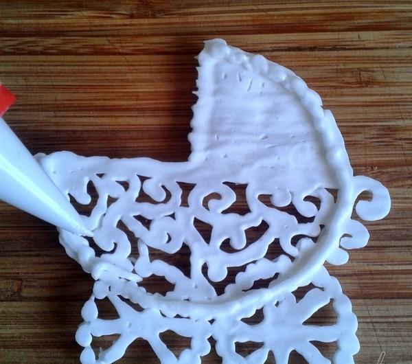 8. Czekamy aż lukier wyschnie. Ja odłożyłam na kilka godzin. ale tak naprawdę wystarczy dotknąć. Jak nie będzie miękki to znaczy, że można zacząć odklejać elementy wózeczka od papieru. Następnie tym samym lukrem sklejamy poszczególne elementy. Spoiwo nakładamy ciągłą linią, przykładamy elementy i odczekujemy chwilę. Wszelkie braki uzupełniamy lukrem.Uwaga - elementy są kruche, ale jeżeli się złamią - można bez problemu skleić lukrem.