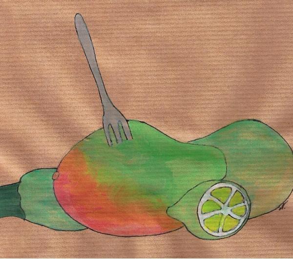 mango miałam pierwszy raz do czynienia. Obrałam je ze skórki i pokroiłam na różniące się kształtem, ale tej samej wielkości kawałki. Na suchą rozgrzaną patelnię położyłam kawałki