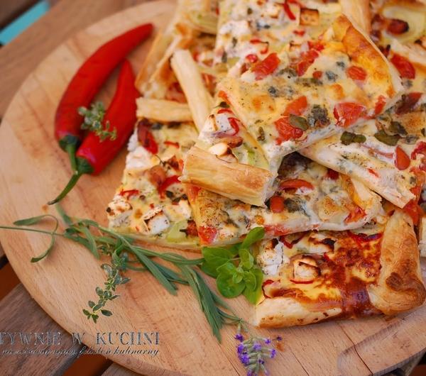 papryczki chilliCukinię obrałam bo miała twardą skórę, pokroiłam w plastry i równo poukładałam na cieście, a reszta składników wylądowała na niej w artystycznym nieładzie.