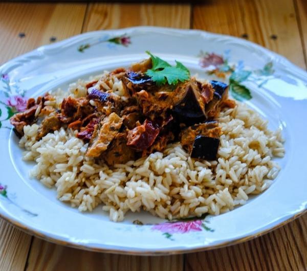 Składniki:- brązowy ryż- sól-kilka goździków- plaster cytryny- 1 bakłażan- 1 czerwona cebula- 2 ząbki czosnku- 10 suszonych pomidorów- śmietana 30 % - 150 ml- bulion warzywny- 150 ml- papryka słodka w proszku- gałka muszkatołowa-sos sojowy- łyżka- pieprz- posiekana kolendra- według uznaniaPrzygotowanie:1. Ugotuj ryż w osolonej wodzie z goździkami i plastrem cytryny- zgodnie z instrukcją na opakowaniu.2. Bakłażan pokrój w kostkę, posól i odstaw w durszlaku na 20 minut, po czym przepłukuj go bieżącą wodą i wysusz papierowymi ręcznikami- dzięki temu straci swoją gorycz :)3. Pokrój drobno cebulę i czosnek. Zeszklij.4. Dodaj bakłażan i pokrojone suszone pomidory. Smaż na złoty kolor5. Wymieszaj w misce śmietankę, bulion, paprykę, sos sojowy, szczyptę gałki muszkatołowej i pieprz.6. Wlej przygotowany sos i duś do zgęstnienia.7. Na koniec dodaj posiekaną kolendrę i podawaj :)