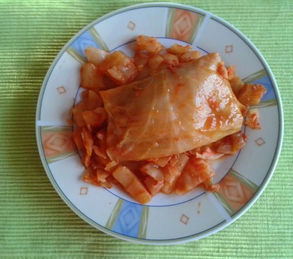 Składniki:1 kg mięsa mielonego1 główka kapusty ok 3 kg250 pasty pomidorowej1 mały przecier pomidorowy1 woreczek ryżu długoziarnistego1 łyżeczka cukru2 żółtka1 sucha bułka1 duża cebulasól,pieprz,majeranekwoda, duży garnekPrzygotowanie:Do miski wkładamy mięso następnie dodajemy żółtka, pokrojoną cebulę, sól, pieprz, majeranek, wsypujemy ryż(może być podgotowany) oraz namoczoną w gorącej wodzie bułkę.Wyrabiamy masę.W dużym garnku parzymy główkę kapusty. potem przy lekkim sparzeniu odcinamy warstwami odchodzące liście.Na liście nakładamy wyrobiony wcześniej farsz i zwijamy zaczynając od boków do środka.Na dnie garnka układamy liście kapusty(tak , aby zakryć dno), a następnie umieszczamy zwinięte gołąbki.Resztkę kapusty kroimy w kostkę i przykrywamy górę.Rozrabiamy pastę pomidorową z przecierem pomidorowym i cukrem dodając wody tak , aby uzyskać rzadki roztwór.Zalewamy gołąbki.Gotujemy na małym ogniu, aż będą miękkie.(ok. 1 h).Smacznego!!!