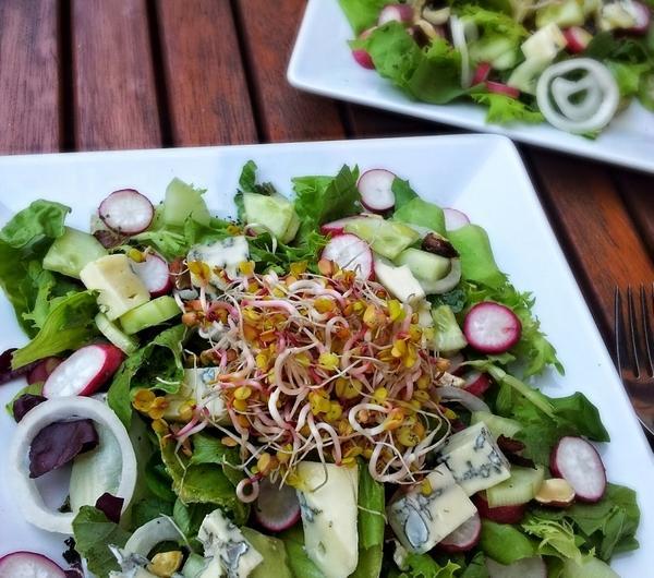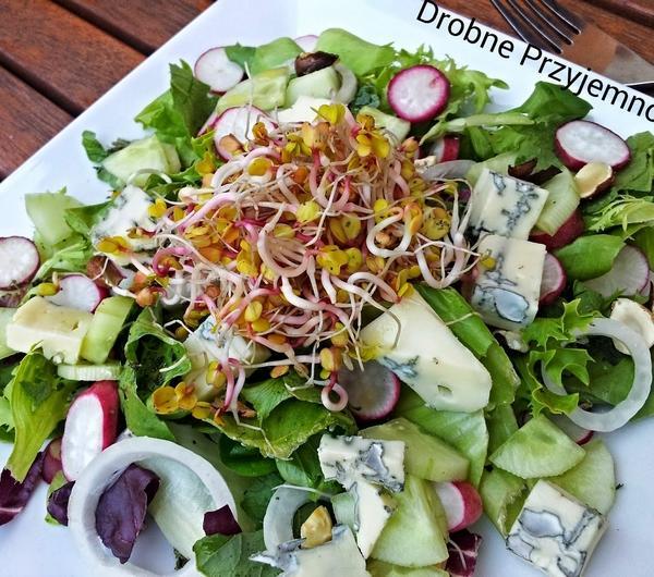 Przepis z tej strony z małymi zmianami.Składniki:pęczek rzodkiewekopakowanie mix sałat (150g)szklanka orzechów laskowychser pleśniowy (nie pamiętam ile gram-w trójkątnym opakowaniu)cebuladługi zielony ogórekkiełki2 łyżki oliwy z oliwek1 łyżeczka musztardy Dijon1 łyżeczka białego octu winnegopieprz do smakuOrzechy przekroić na pół i uprażyć. Rzodkiewki pokroić w plasterki, ser w kosteczkę, ogórka w ćwiartki a cebulę w krążki. Sałatę wyłożyć na talerz, następnie ułożyć pozostałe składniki. W miseczce połączyć musztardę z octem i nie przerywając mieszania wlać oliwę. Polać sosem i oprószyć pieprzem do smaku a na wierzch położyć kiełki.Smacznego! :)