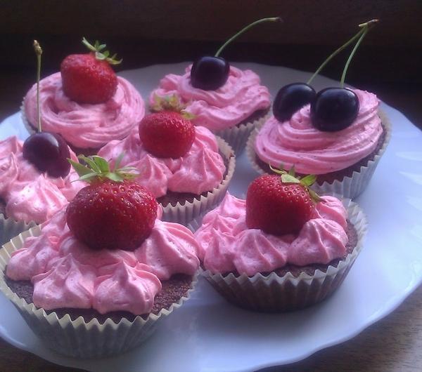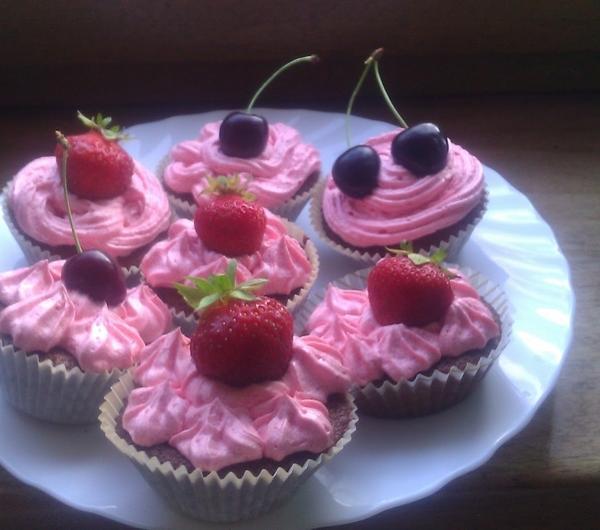Potrzebujemy na 12 muffin:125g miękkiego masła180ml mleka 1,5%40ml soku z truskawekmała szklanka cukru (ok 50g)2 jajka1 łyżeczka proszku do pieczenia1 łyżeczka sodykrem:3 łyzki maki pszennej100 ml mleka50 g cukru110g masłaesencja waniliowa 2-4 łyżki20ml soku z truskawekbarwnik spozywczy czerwonyWykonanie:Utrzyj mało z cukrem aż stanie się jednolitą puszystą masą. Ciągle mieszając , powoli dodawaj rozbełtane jajka. Dodaj mąki w zalezności jaka bedzie konsystencja troche więcej lub mniej plus proszku i sody.Napełnij papilotki i piecz ok 25 minut w 180C na koniec sprawdź patyczkiem czy po wyjeciu z babeczki bedzie czysty.Jesli zostanie na nim ciasto dołóżcie 5minut bo babeczki są bardzo wilgotne.Krem:mleko, sok i makę wymieszaj w kubku , przelej do rondelka i gotuj aż masa zrobi się gęsta(jak na karpatkę) zostaw do ostygniecia. Utrzyj masło z cukrem( jak wyżej) połącz z masą , dodaj esencji i ew barwnika . Ubijaj w mikserze az nie bedzie jednolita. Dekoruj rekawem cukierniczym ostygniete babeczki. Udekoruj czereśniami i truskawkami oczywiscie umytymi. Smacznego!Ps- zdjęcia na szybko więc tylko dwa;/