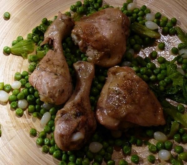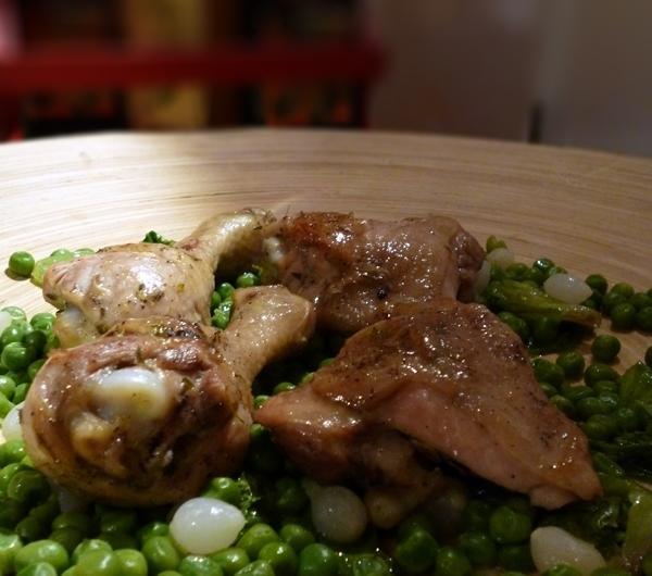 UDKA KURCZAKA Z DUSZONYM GROSZKIEM I CEBULKAMISkładniki:4 duże nóżki z kurczaka2 łyżki oliwy z oliwekpęczek tymianku (ciężko ocenić ile to jest, sugeruję dodać garść tymianku)jeden duży ząbek czosnku20 gr masła/25 gr do groszku250 ml wody200 gr młodych, małych cebulek (nie polecam z zalewy octowej)600 gr zielonego groszkugłówka sałaty (np. rzymska)Wykonanie:Przygotuj marynatę z oliwy, tymianku, czosnku, soli i pieprzu i pozostaw w niej kurczaka przez jakiś czas. Na dużej patelni rozgrzej odrobinę oliwy i usmaż nóżki na złoty kolor. Zmniejsz ogień do minimum, dodaj 20 gr masła oraz 100 ml wody. Przykryj patelnię i podduś ok 15 minut.W tym czasie, na drugiej patelni rozpuść pozostałe masło. Wrzuć cebulki i smaż na wolnym ogniu do miekkości. Dodaj tymianek (kilka gałązek), groszek oraz wodę. Przyprawić solą i pieprzem i dusić tak długo, aż groszek będzie krzyczał nie! Wtedy dodaj rozdrobnione liście sałaty i po minucie zdejmij patelnię z ognia.Podawaj zaraz po przygotowaniu. Ułóż kawałki mięsa na groszku z cebulką.Smacznego!