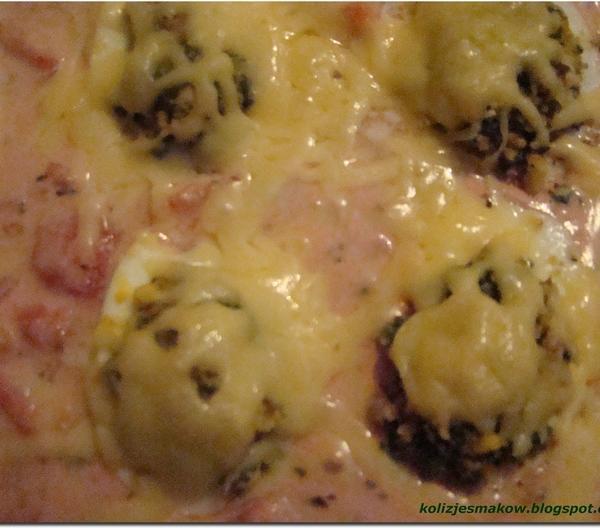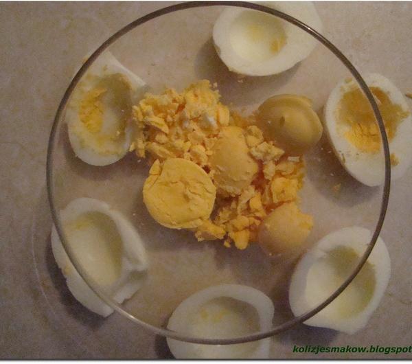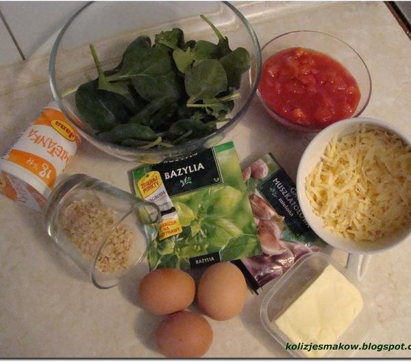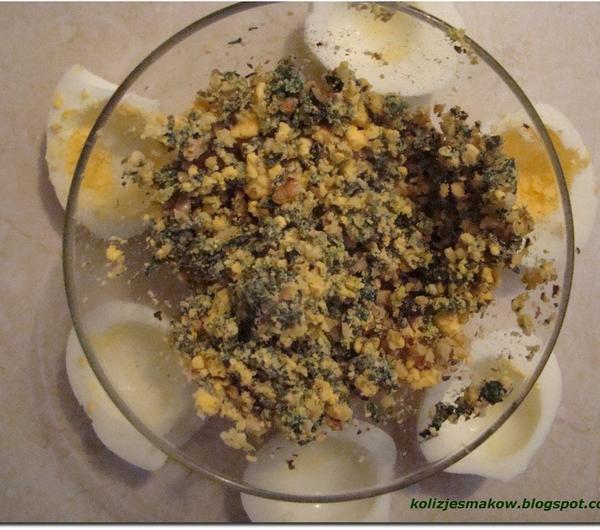 Czas przygotowania: 20 minut + 20 pieczeniaIlość porcji: 3Składniki:3 jajkamiska szpinaku1 łyżeczka rozrodbnionych orzechów włoskich70ml śmietany 18% ( może być też 12, jeśli akurat mamy)2 ząbki czosnku1 łyżeczka masłapuszka pomidorów krojonych ( latem można użyć do tego przepisu świeżych pomidorów)około 50 gram startego żółtego sera1 łyzeczka bazylisół, pieprz, gałka muszkatowaJajka gotujemy, obieramy i kroimy na pół. W tym czasie gotujemy również szpinak w osolonej wodzie do zwiędnięcia. Jeśli nie mamy szpinaku można go zastąpić brokułami lub szczawiem. Wyciągamy żółtko z jajek i wrzucamy je do miseczki. Dodajemy do niego ugotowany i pokrojony szpinak, orzechy włoskie i jeden ząbek czosnku przeciśnięty przez praskę. Doprawiamy gałką muszkatową, solą i pieprzem. Napełniamy jajka farszem. Pomidory mieszamy z drugim ząbkiem czosnku i bazylią. Doprawiamy równiez solą i pieprzem. Dolewamy śmietane i intensywnie mieszamy lub miksujemy blenderem. Naczynie żaroodporne smarujemy masłem, wlewamy do niego sos i układamy na nim jajka. Posypujemy żółtym serem i wstawiamy do nagrzanego piekarnika(180stopni) na 20 minut. Po tym czasie jajka wykładamy na talerz, podlewamy sosem i podajemy :)
