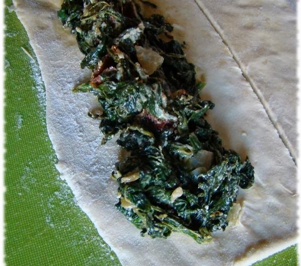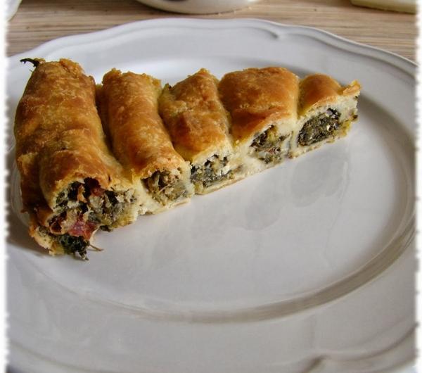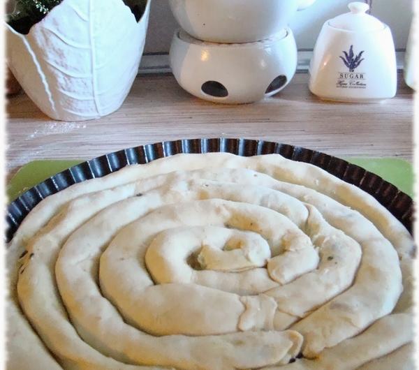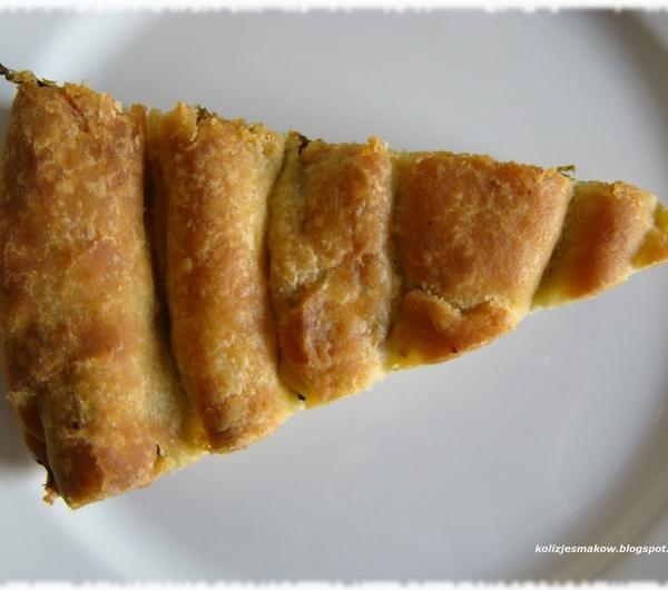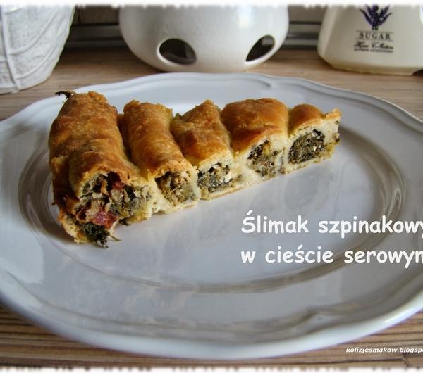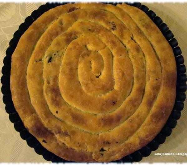 250g margaryny250g ricottyFarsz:Opakowanie mrożonego szpinaku liściastego100g fety140g suszonych pomidorów w olejuJajkoCebulaCzosnekSól, pieprzMargarynę posiekać nożem i wyłożyć na podsypany mąką blat. Następnie dodać mąkę wraz z serem. Wyrobić ciasto. Zawinąć z folię spożywcza i umieścić w lodówce na jakieś 20 minut. W między czasie przygotować farsz. Cebule obieramy i kroimy w kosteczkę, a następnie podsmażamy na patelni. Po chwili dodajemy przeciśnięty przez praskę czosnek i dorzucamy rozmrożony szpinak. Całość chwilkę dusimy na patelni. Suszone pomidory kroimy w paski i dorzucamy do szpinaku. Fetę rozdrabniamy i dorzucamy do farszu, całość mieszamy. Doprawiamy delikatnie solą i pieprzem. Wyłączamy gaz i wrzucamy jajko, delikatnie mieszamy. Wyjmujemy ciasto z lodówki, wałkujemy i wykrajamy paski. Na każdy nakładamy farsz i zawijamy w rurkę. Układamy w formie do tarty rozpoczynając od brzegów. Kolejne kawałki dołączamy do poprzednich i zawijamy jak muszla ślimaka do środka formy. Po wyłożeniu całej formy pieczemy 40 minut w temp 180 stopni Celsjusza. Podajemy koniecznie na ciepło.