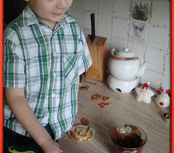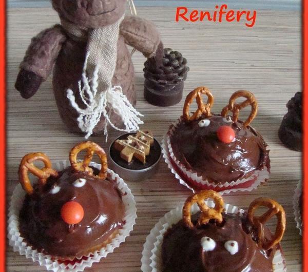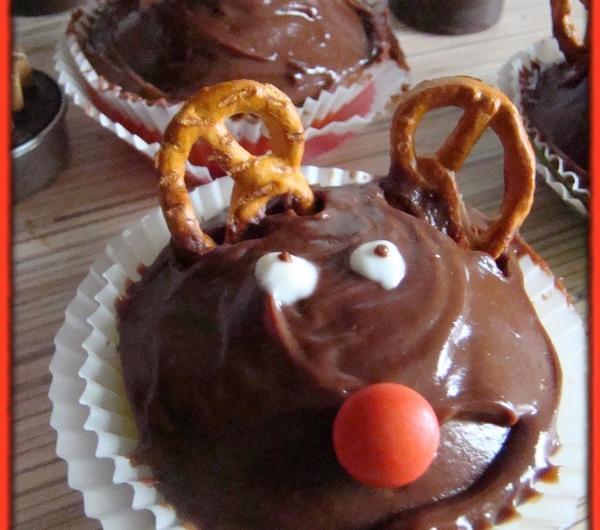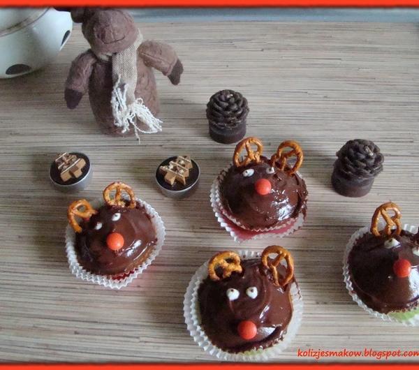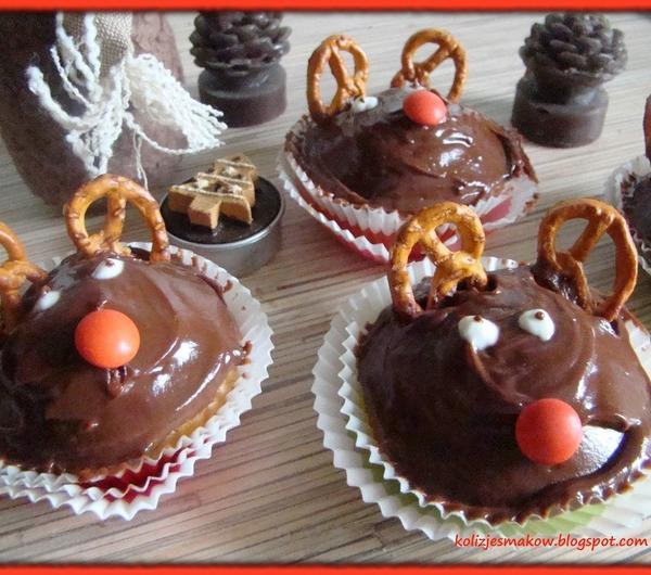 10 muffinek np. piernikowych z bakaliami80g czekolady ciemnej gorzkiej80g serka homogenizowanego10 czerwonych drażyOk. 20 precelkówCzekoladę roztapiamy w kąpieli wodnej lub w kuchence mikrofalowej. Odkładamy pół łyżeczki na oczy reniferów. Stopioną czekoladę mieszamy z serkiem homogenizowanym zostawiając pół łyżeczki serka. Powstałą masą smarujemy babeczki, następnie w miejsce nosa kładziemy czerwoną drażę. Przy pomocy serka w miejscu oczu robimy plamki, a w sam ich centrum przy pomocy czekolady źrenice. Precelki układamy w miejscu uszu i gotowe. Można wreszcie zajadać ;).