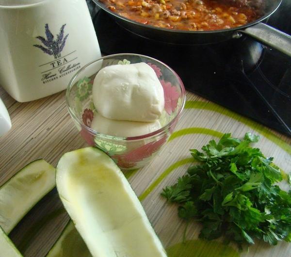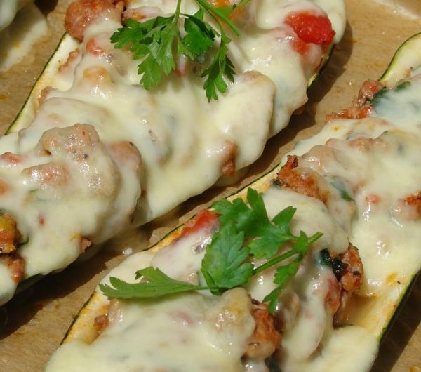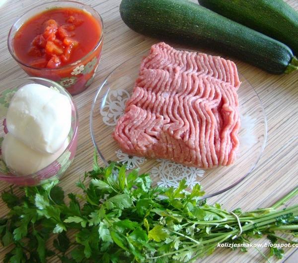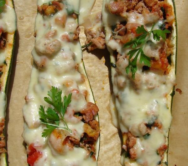 cukinii z mięsnym farszem. Fajne, smaczne i orginalne danie obiadowe. Sporym jego plusem jest możliwość przygotowania dania wcześniej i zapieczenia w piekarnika po powrocie z pracy. A jeśli posiadamy fantastyczny sprzęt z nastawieniem czasowym na samodzielne włączeni o konkretnej godzinę, to już od progu mogą nas widać cudowne aromaty pieczonej
