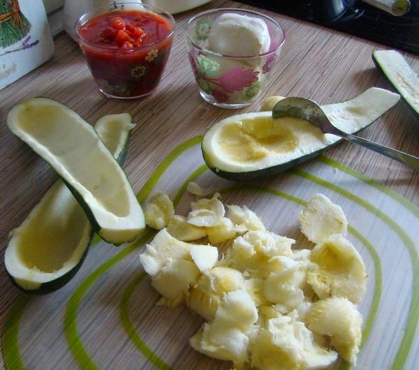 cukinie i przy pomocy łyżki wydrążamy środek. Miąższ drobno kroimy. Dorzucamy do przesmażonego