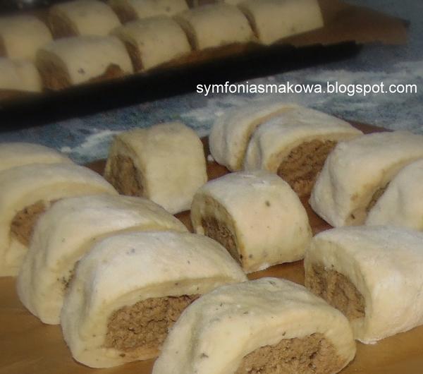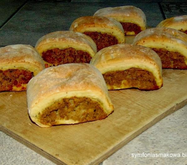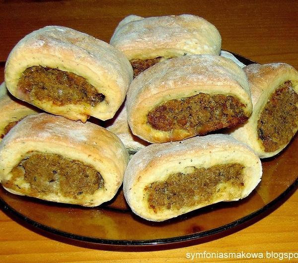 600 g mąki50 g świeżych drożdży1 żółtko jajka1 szklanka wody1 łyżeczka soli1 łyżeczka bazylii1 łyżka cukru1 łyżka olejuPrzygotowanie:Cebulę kroimy w kosteczkę i razem z mięsem mielonym podsmażamy. Posypujemy oregano. Nie dodajemy tłuszczu, gdyż wytopi się z mięsa. Zostawiamy do wystygnięcia.Następnie wszystkie rodzaje mięsa, a także marchewkę i pietruszkę przepuszczamy 2 razy przez maszynkę do mięsa lub blendujemy. Dodajemy jajko oraz obficie sól, pieprz i bardzo dokładnie mieszamy.Przygotowujemy ciasto. Drożdże rozcieramy z cukrem i pozostawiamy na około 5 minut. Mąkę mieszamy z solą, wlewamy zaczyn z drożdży, ciepłą wodę i dodajemy bazylię oraz żółtko jaja. Mieszamy i wyrabiamy ciasto. Gdy będzie zbyt lepkie dodajemy jeszcze trochę mąki. Na koniec wlewamy olej i nadal wyrabiamy, aż ciasto będzie gładkie.Gotowe ciasto przykryte ściereczką odstawiamy do wyrośnięcia na 40 minut w ciepłe miejsceCiasto dzielimy na pół i wałkujemy je na dwa prostokąty o wymiarach około 15 x 40 cm. Wzdłuż ciasta wykładamy mięsny farsz. Zwijamy w rulony i dokładnie sklejamy. Przewracamy ciasto, aby połączenie znalazło się na spodzie. Rulony kroimy na równe około 4 centymetrowe kawałki.Piekarnik nagrzewamy do 200 stopni z termoobiegiem. Na blaszce układamy papier do pieczenia, a na nim paszteciki i pieczemy około 20-30 minut do zarumienienia.Smacznego!