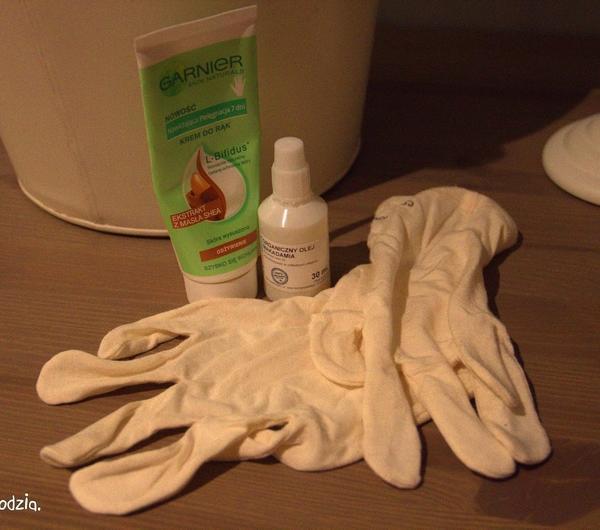 Zestaw, jak widać na powyższym zdjęciu składa się z rękawiczek pielęgnacyjnych Eco Tools, kremu do rąk Garnier Skin Naturals z masłem shea oraz organicznego oleju makadamia. Efekt około miesięcznego zużywania i smarowania to: prawie dwie zużyte tubki kremu, 1/3 zużytej buteleczki oleju i kilkanaście prań rękawiczek oraz - zdecydowane odżywienie, nawilżenie (trwałe) i wygładzenie dłoni :)Moje dłonie, to dłonie zmaltretowane. Ciągłe mycie rąk noszenie rękawiczek jednorazowych w pracy robi swoje, że tak ładnie powiem. Są wiecznie przesuszone, potrafią popękać i często robią się czerwone i szorstkie. Do tego wrażliwa skóra na nich, nie tolerująca większości mydeł w płynie, ani żadnych wyciągów owocowych. Multum przetestowanych kremów, brak idealnego, kremy na receptę od dermatologa, maści. Czasem gdy jest źle, sięgam nawet po maści sterydowe, kiedy to już naprawdę nie mogę sobie z nimi dać rady i zaczyna się jakiś stan zapalny z podrażnienia.Bambusowe rękawiczki pielęgnacyjne ECO TOOLS.Są dostępne w sieci Rossmann. Według producenta wspomagają działanie kremów, czy maści stosowanych na dłonie. Mają też odprężać zmęczone dłonie. Ale wiadomo, że same raczej tego nie zrobią. Lubię je, ponieważ są bardzo cieniutkie, delikatne, nie uciskają, a założone na nakremowane dłonie, ale najważniejsze, że naprawdę wspomagają regenerację dłoni i działanie stosowanych specyfików. Także zdecydowanie polecam.Krem do rąk Garnier Skin Naturals, Nawilżająca Pielęgnacja z ekstraktem z masła shea, Skóra wysuszona, Odżywianie.