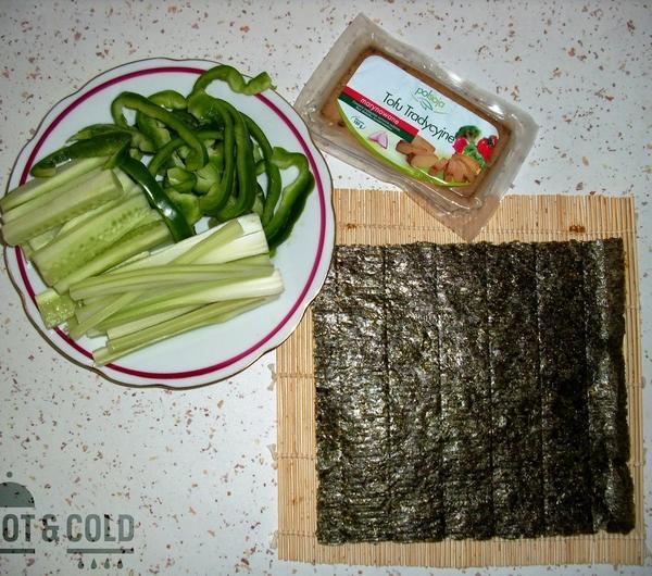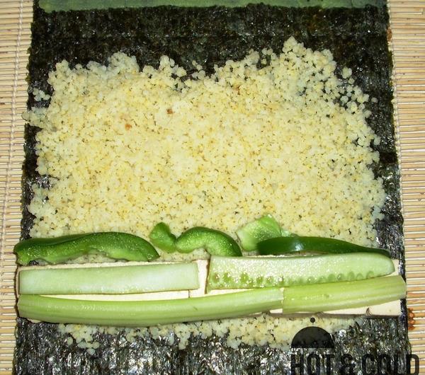 kaszę polewamy sosem, mieszamy i odstawiamy do ostygnięcia.Na macie bambusowej kładziemy 1 płat wodorostów: