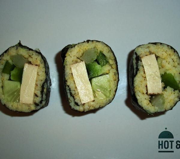 kaszę i dodatki. Jeden brzeg (na zdjęciu górny) smarujemy odrobiną wasabi i przy pomocy maty bambusowej zwijamy rulon. który później kroimy na 1,5-2 cm kawałki przy pomocy bardzo