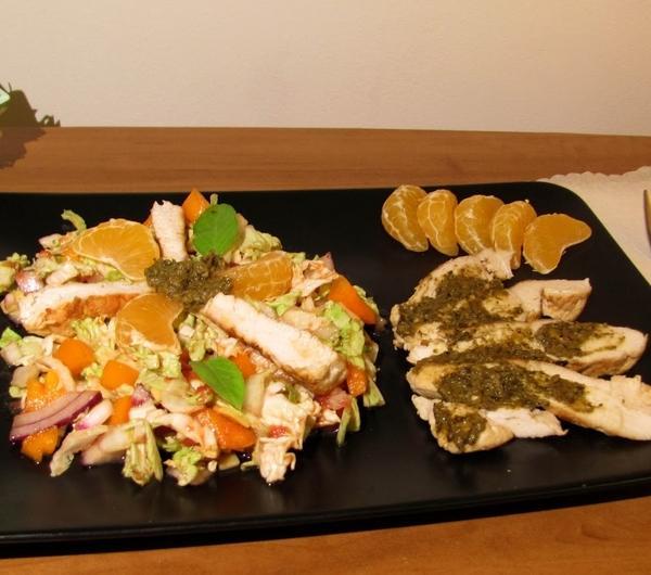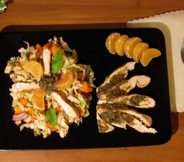 sałatkę, nałożyć na talerz. Położyć na nią pocięty w paski filet (resztę