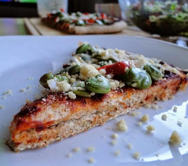 Pizza na orkiszowym cieście, posypana wegańską "parmezanową" posypką, którą już prezentowałam w tym przepisie :) Wszystkim nam bardzo smakowała...Składniki na ciasto:2.5 szkl mąki orkiszowej razowej25g świeżych drożdży1 łyżeczka miodu lub innej substancji słodzącej (cukier nierafinowany, syrop z agawy, itp.)1/2 łyżeczki soli morskiejwoda, w takiej ilości by powstało elastyczne ciasto (u mnie ok 1.5 szkl)Obłożenie:sos pomidorowy: 3 łyżki przecieru pomidorowego, 2-3 łyżki wody, 1 łyżka octu balsamicznego, 1-2 łyżki oliwy, przyprawy (użyłam ziół prowansalskich, czosnku niedźwiedziego oraz pieprzu ziołowego)ok. 300g ugotowanego, obranego bobu1/2 czerwonej papryki, pokrojonej w paski1/2 cebuli, pokrojonej w pióraposypka "parmezanowa" (1 szkl zblanszowanych migdałów, zmiksowanych z dodatkiem 2-3 łyżeczek płatków drożdżowych i szczyptą soli morskiej)Z drożdży, miodu, 1/2 szkl wody oraz kilku łyżek mąki zrobiłam zaczyn, który odstawiłam na 15-20 minut by drożdże "ruszyły". Następnie przełożyłam zaczyn do pozostałej mąki, dodałam sól i taką ilość wody by otrzymać elastyczne ciasto. Zagniatałam kilka minut, po czym odstawiłam ciasto na ok. 1h do wyrośnięcia.Piekarnik nagrzałam do 200 stopni (trzymałam w nim blachę, na której następnie piekłam pizzę).Wszystkie składniki sosu wymieszałam.Gdy ciasto wyrosło jeszcze raz je zagniotłam, rozwałkowałam i ułożyłam na gorącej blasze posypanej mąką. Wstawiłam na 5 minut do piekarnika, by podpiec ciasto. Następnie wyjęłam je z piekarnika, rozsmarowałam sos, obłożyłam bobem, papryką oraz cebulą. Ponownie wstawiłam do piekarnika na ok 10 minut.Po wyjęciu ciasta z piekarnika pokroiłam je na kawałki, które posypaliśmy "parmezanową" posypką.