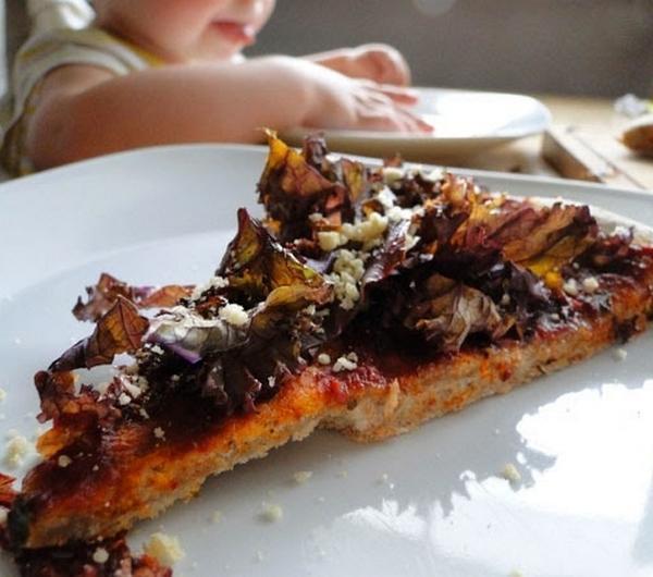 Kolejna wersja wegańskiej pizzy. Tym razem z dodatkiem czerwonego jarmużu, który się fajnie przypieka (i chrupie) oraz posypką "parmezanową". Oczywiście jarmuż może być tradycyjny, zielony :) Mnie akurat udało się dostać taką wersję, o której istnieniu wcześniej nawet nie wiedziałam... Pyszna pizza!Składniki na ciasto:2.5 szkl mąki orkiszowej razowej25g świeżych drożdży1 łyżeczka substancji słodzącej (ja zwykle używam miodu, ale by pizza była całkowicie wegańska można użyć syropu klonowego, cukru nierafinowanego, itp.)1/2 łyżeczki soli morskiejwoda, w takiej ilości by powstało elastyczne ciasto (u mnie ok 1.5 szkl)Obłożenie:sos pomidorowy: 3 łyżki przecieru pomidorowego, 2-3 łyżki wody, 1 łyżka octu balsamicznego, 1-2 łyżki oliwy, przyprawy (użyłam ziół prowansalskich, czosnku niedźwiedziego oraz pieprzu ziołowego)3-4 liście jarmużu, posiekane (gałązki należy wyciąć)posypka "parmezanowa" (1 szkl zblanszowanych migdałów, zmiksowanych z dodatkiem 2-3 łyżeczek płatków drożdżowych i szczyptą soli morskiej)Z drożdży, cukru/miodu, 1/2 szkl wody oraz kilku łyżek mąki zrobiłam zaczyn, który odstawiłam na 15-20 minut by drożdże "ruszyły". Następnie przełożyłam zaczyn do pozostałej mąki, dodałam sól i taką ilość wody by otrzymać elastyczne ciasto. Zagniatałam kilka minut, po czym odstawiłam ciasto na ok. 1h do wyrośnięcia.Piekarnik nagrzałam do 200 stopni (blacha, na której następnie piekłam pizzę znów była w środku, by również się nagrzała).Wszystkie składniki sosu wymieszałam.Gdy ciasto wyrosło jeszcze raz je zagniotłam, rozwałkowałam i ułożyłam na gorącej blasze posypanej mąką. Wstawiłam na 5 minut do piekarnika, by podpiec ciasto. Następnie wyjęłam je z piekarnika, rozsmarowałam sos, posypałam siekanym jarmużem. Ponownie wstawiłam do piekarnika na ok 10 minut.Po wyjęciu pizzy z piekarnika pokroiłam ją na kawałki, które posypaliśmy "parmezanową" posypką.