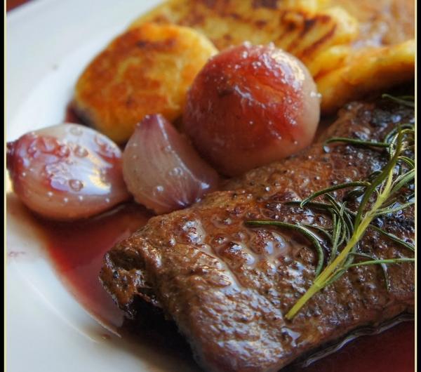 szalotkami. Czas smażenia wg upodobań - z każdej strony po 1-2 minuty (mało wysmażony), 3-4 minuty (średnio wysmażony), 5-6 minut (dobrze wysmażony). Mąż smażył po 4 minuty. Po obsmażeniu