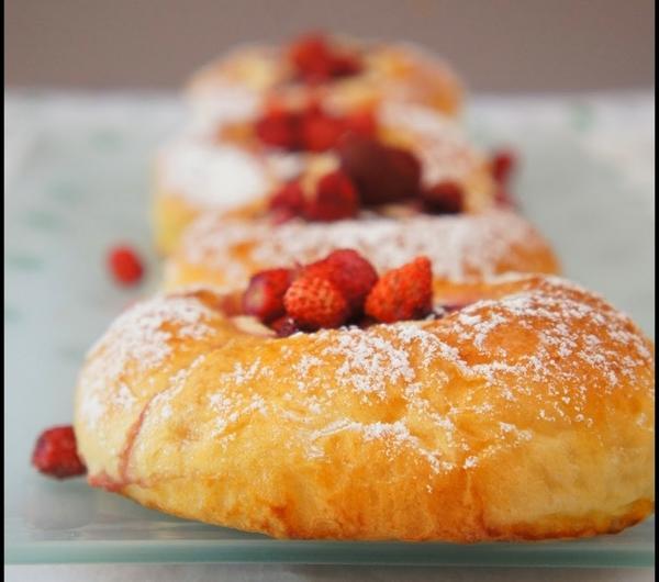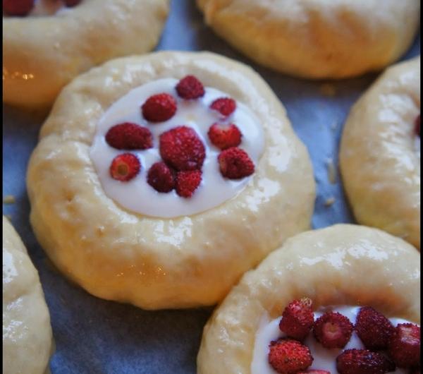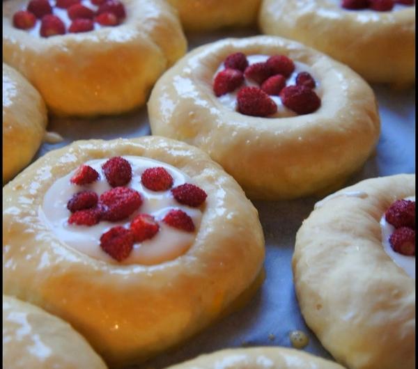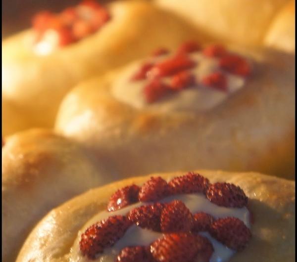 wodnej (lekko przestudzonej). Wszystko dokładnie wymieszać.Po 30 minutach bułeczki urosną :) następnie szklanką (z niezbyt szerokim dnem) w każdej bułeczce robimy wgłębienie - należy dociskać aż do samej blachy. Nakładamy wcześniej przygotowany farsz (1,5 łyżki do każdej bułeczki) oraz po ok. 10 poziomek. (nie więcej bo farsz wypłynie). Na koniec bułeczki smarujemy