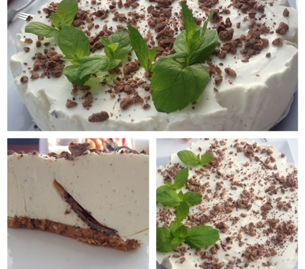 Składniki spodu:- 135 g zmiksowanych suchych ciasteczek LU Digestive w czekoladzie- 65 g rozpuszczonego masłaSkładniki sernika:- 1 kg sera twarogowego- 200 g cukru- 6 płaskich łyżeczek żelatyny w proszku- 8 łyżek zimnej wody- 4 łyżki soku z cytryny- 500 ml śmietany kremówki- świeża mięta pęczek- około 130 g czekoladek miętowychPrzygotowanie:Zmielone ciastka łącze z rozpuszczonym masłem i wykładam nim spód foremki. Wkładam do lodówki. 100 m kremówki gotuję z garścią mięty i zostawiam pod przykryciem do wystudzenia. Jak już wystygnie odcedzam śmietankę i wyciskam liście mięty. Do sera dodaję cukier i miksuje. Żelatynę rozpuszczam w zimnej wodzie. Jak już napęcznieje podgrzewam ją w kąpieli wodnej aby stała się płynna. Dodaję razem z sokiem z cytryny do masy twarogowej. Odcedzone liście mięty miele i dodaję ze śmietanką do masy. Pozostałą ilość kremówki ubijam na bitą śmietanę i dodaję czekoladki miętowe w całości. Wykładam masę na foremkę z lodówki i wkładam ją tam jeszcze na przynajmniej godzinę. Dekoruję czekoladą i listkami mięty.