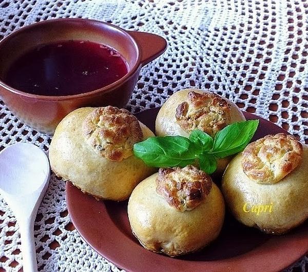 250 gram mąki pszennej (świetnie sprawdzi się również pełnoziarnista)25 gram drożdży1 łyżeczka cukru1/3 łyżeczki soli1 szklanka ciepłej wodyfarsz:200 gram bryndzyżółtko0,5 łyżki kwaśnej gęstej śmietany 18%kminek1 cebulapieprzrozmącone jajo do posmarowania brzegówW ciepłej wodzie rozprowadzamy drożdże z 1 łyżeczką cukru i 1 łyżeczką mąki, odstawiamy na 15 minut do "ruszenia".Następnie mąkę przesiewamy z solą, dodajemy wyrośnięty rozczyn, zagniatamy elastyczne ciasto, wkładamy do omączonej miski, pozostawiamy do podwojenia objętości na około 40 minut.Nasiona kminku wsypać na sito, przelać wrzątkiem, odsączyć.Cebulę pokroić w kosteczkę, przesmażyć na złoto na niewielkiej ilości masła ( 1 łyżeczka).Bryndzę rozcieramy z żółtkiem i śmietanką, dodajemy cebulę, kminek, pieprz, ja soli nie dodawałam, bo mój ser był bardzo słony.Wyrośnięte ciasto odgazować, podzielić na 6 równych części, każdą uformować w bułeczkę, spłaszczyć ją lekko, na środku zrobić wgłębienie, wypełnić farszem serowym, każda bułeczkę układać na blasze wyłożonej papierem do pieczenia, zostawić na 20 minut do napuszenia. Następnie posmarować brzegi ciasta rozmąconym jajem, piec około 30 minut w temperaturze 200 stopni.