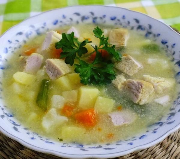 porcja mięsna na zupkę ( u mnie kawałek schabu z kością i 1 filet z kurczaka)2 garście mieszanki mrożonej warzywnej ( u mnie wiosenna)4 średnie ziemniaki1/3 szklanki wody + 4 łyżki kaszy manny (na około 1,5 litra zupy)vegeta, sól, pieprz, ewentualnie MaggiMięso zlać wodą, dodać vegetę, gotować do miękkości (można pokroić je w kostkę, będzie szybciej gotowe), uzupełniając wodę, potem wyjąć je na talerzyk. Do uzupełnionego do pierwszego poziomu wywaru wrzucamy warzywa, pokrojone w kostkę ziemniaki, gotujemy około 15 minut, dodajemy przyprawy, pokrojone w kotkę mięsko. Kaszę mieszamy z wodą, wlewamy jednym ruchem do zupy, mieszając zagotowujemy do zgęstnienia ( około 2 - 3 minut). Podajemy z siekaną zieleniną.
