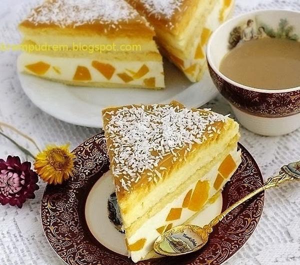 przepis z moimi zmianami stądprzepis na jeden biszkopt, należy upiec 3 sztuki:3 jaja3 łyżki mąki pszennej tortowej¼ łyżeczki proszku do pieczenia3 łyżki cukru0,5 łyżeczki cukru waniliowegoponcz:3/4 szklanki wody + sok z 0,5 cytryny (ponczujemy pierwszy i drugi biszkopt biszkopt)masa serowo – śmietanowa:0,5 kg twarogu zmielonego (może być każdy wiaderkowy)0,5 litra śmietany kremówki 30%7 łyżek cukru pudru (spróbujcie czy taka ilość Wam pasuje)4 płaskie łyżki żelatyny + 0,5 szklanki wrzątkupuszka brzoskwiń w syropiemasa budyniowa:1 litr mleka2 kopiaste łyżki mąki krupczatki2 budynie waniliowe lub śmietankowe bez cukru (takie po 40 gramów)200 gramów czekolady białej400 gramów miękkiego masła4 kopiaste łyżki cukru2 płaskie łyżki cukru waniliowego4 żółtka (opcjonalnie, ja nie dałam)ponadto:puszka masy kajmakowej (krówkowej, dałam z Gostynia)2 – 3 garście wiórków kokosowych do posypania ciastaBiszkopty:Białka oddzielamy od żółtek, ubijamy je ze szczyptą soli na sztywną piane, dodajemy cukry, ubijamy, następnie dodajemy żółtka, mąkę przesianą z proszkiem do pieczenia, miksujemy na średnich obrotach do połączenia składników. Blachę o wymiarach 24x36 cm lub tortownicę o średnicy 33 cm (ja tak piekłam), wykładamy papierem do pieczenia, smarujemy go leciutko, ale równomiernie olejem, wylewamy ciasto, równamy powierzchnię, pieczemy 15 minut w temperaturze 180 stopni. Upieczone ciasto wyjmujemy razem z papierem, układamy na równej powierzchni (nie odrywajmy od razu papieru, dopiero, kiedy wystygnie). W ten sam sposób pieczemy pozostałe dwa biszkopty.Masa serowo – śmietanowa:Schodzoną porządnie kremówkę ubijamy na sztywno, dodajemy cukier puder, ubijamy jeszcze przez minutkę. Do śmietanki dodajemy twarożek, ucieramy wszystko razem do dokładnego połączenia.Żelatynę dokładnie rozprowadzamy we wrzątku, odstawiamy do przestudzenia (ma być chłodna, ale wciąż płynna), dodajemy do niej 2 łyżki masy serowej, dokładnie mieszamy ją z żelatyną, wlewamy małym strumieniem do masy serowej i miksujemy dokładnie.Brzoskwinie odsączamy z zalewy, kroimy na mniejsze kawałki, dodajemy je do masy serowej i delikatnie mieszamy.Pierwszy biszkopt nasączamy ponczem, wykładamy na niego masę serową z brzoskwiniami, wyrównujemy powierzchnię, wkładamy do lodówki. Dopiero kiedy masa nam stężeje, przykrywamy ją drugim blatem biszkoptowym i delikatnie, z czuciem dociskamy.Masa budyniowa:Połowę mleka zagotowujemy, drugą połowę przelewamy do kubka, dosypujemy do niej budyń, cukier i cukier waniliowy, mąkę krupczatkę, żółtka (opcjonalnie), mieszamy dokładnie (najlepiej najpierw łyżeczką, a potem mątewką lub trzepaczką rózgową), wlewamy porcjami do gotującego mleka i mieszamy aż do zgęstnienia masy. Masę schładzamy do temperatury pokojowej. Następnie dodajemy do niej po 1 łyżce miękkiego masła, ucieramy aż do wykończenia tłuszczu.Czekoladę roztapiamy w kąpieli wodnej, studzimy, ale ma być lekko ciepła. Czekoladę dodajemy do kremu budyniowego i ucieramy wszystko do całkowitego połączenia składników (ucierałam blenderem).Drugi biszkopt ponczujemy tak, jak pierwszy.Na drugi naponczowany biszkopt wykładamy masę budyniową, wyrównujemy powierzchnię, przykrywamy trzecim blatem i leciutko dociskamy. Powierzchnię biszkoptu smarujemy masą krówkową, wygładzamy powierzchnię i posypujemy wiórkami kokosowymi.Schładzamy przez parę godzin w lodówce.