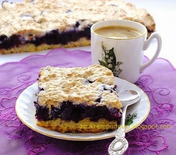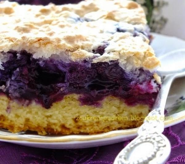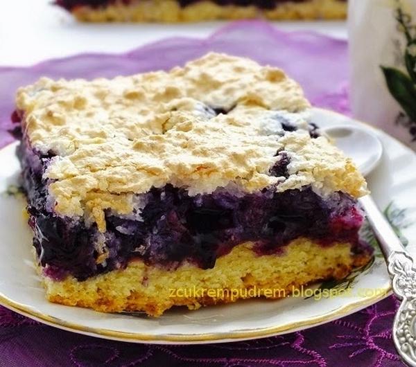 ciasto kruche:280 gramów mąki pszennej (użyłam tortowej)150 gramów zimnego masła4 płaskie łyżki cukru1 płaska łyżka cukru z wanilią2 płaskie łyżeczki proszku do pieczenia2 żółtkabeza kokosowa:2 białka5 łyżek cukru100 gramów wiórków kokosowychdodatkowo:550 - 600 gramów borówek amerykańskich1,5 łyżki bułki tartejMąkę przesiać z proszkiem do pieczenia, cukrami. Dodać masło, posiekać nożem z mąką tak, by tłuszcz był mocno rozdrobniony, potem wbić żółtka, wyrobić szybko kruche ciasto.Ciasta nie wkładałam do lodówki.Kwadratową blaszkę o boku 24 cm wyłożyć papierem do pieczenia, dno wylepić ciastem, nakłuć w kilkunastu miejscach, wsadzić do piekarnika nagrzanego do 180 stopni i podpiec około 20 - 25 minut, na złoto.Białka ubić na sztywno, dodać cukier, miksować chwilkę, następnie wsypać wiórki i dokładnie wymieszać łyżką.Na ciepłe ciasto wysypać borówki, posypać bułką tartą, przykryć pianą. Piec około 15 - 20 minut w temperaturze 180 stopni, do zezłocenia bezy.