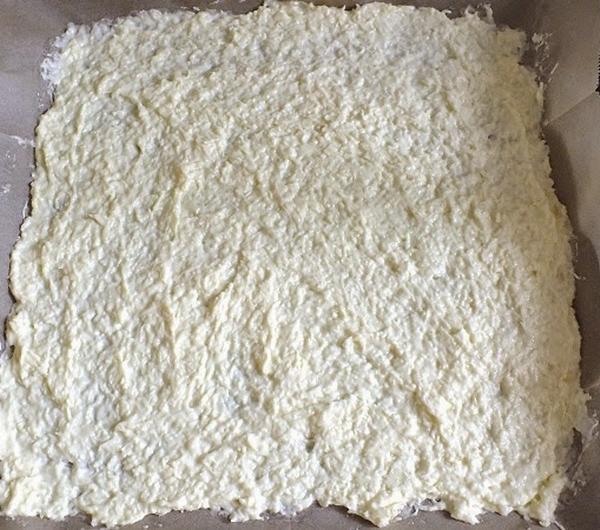 Blachę z wyposażenia piekarnika wykładamy papierem do pieczenia, który cienko smarujemy olejem.Masę majonezowo - serową rozprowadzamy równomiernie cienką (!) warstwą po papierze ( aby ułatwić sobie robotę, możemy łyżkę maczać w zimnej wodzie, jednak uważamy by nie przenieść zbyt dużowilgoci na powierzchnię ciasta).