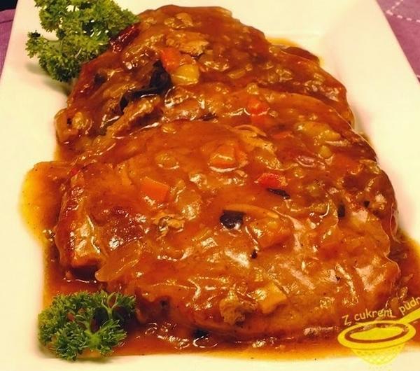 8 - 9 plastrów karkówki wieprzowej (takich o grubości 1 cm)2 paczki zupy cebulowej po 30 gramów (użyłam z Knorr'a)1 paczuszka Fixu do potraw chińskich (również Knorr)2 duże cebuleczarny pieprz3 szklanki zimnej wodyMięso myjemy i dokładnie osuszamy. Nie rozbijamy, posypujemy czarnym pieprzem i podsmażamy na oleju na patelni, następnie przekładamy do głębokiego naczynia żaroodpornego typu gęsiarka.Z pozostałego na patelni tłuszczu zbieramy szumy.Cebule kroimy w półtalarki, przysmażamy na tym samym tłuszczu co wcześniej mięso. Cebulę wykładamy równomiernie na mięso.