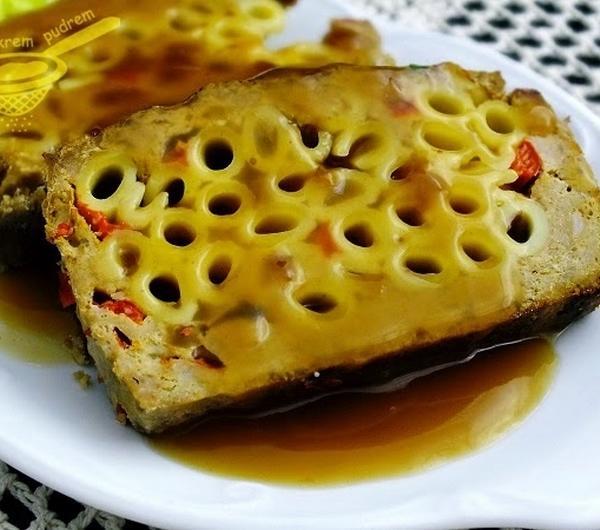 masa mięsna:750 gramów łopatki lub karczku wieprzowego1 jajo1 średnia cebula1 kajzerka namoczona w mleku i odciśnięta2 ząbki czosnkusólsproszkowana słodka i ostra papryka wg smakuczarny pieprzdodatkowo:250 gramów makaronu typu pennemleko z dodatkiem soli i pieprzuewentualnie mocno doprawiony bulion wołowy lub warzywny1 duży strąk słodkiej czerwonej paprykiMięso mielimy na średnich oczkach razem z odciśniętą bułeczką, dodajemy jajo, posiekaną drobno cebulę, przeciśnięty przez praskę czosnek, przyprawy, całość wyrabiamy na jednolitą masę.Makaron gotujemy al dente w mleku lub bulionie, odcedzamy, lekko schładzamy.Paprykę dzielimy na dwie części: 1/3 kroimy w drobną kosteczkę, 2/3 w paseczki.Mniejszą część (pokrojoną w kosteczkę) dodajemy do mięsa, wyrabiamy.Foremkę keksową o wymiarach 12x25 cm smarujemy olejem, dno i boki wykładamy warstwą mięsa, zużywając około 2/3 całej masy.
