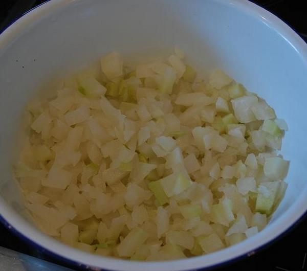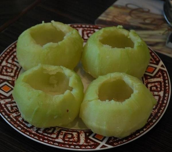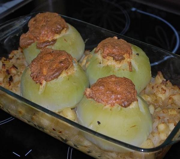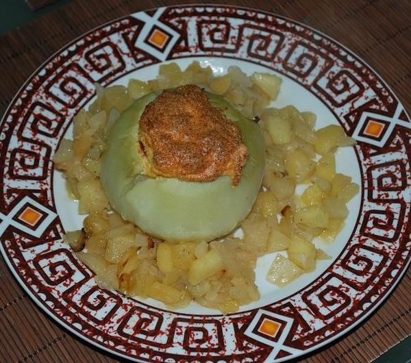 Kalarepy obrać, następnie ugotować na półtwardo w osolonej wodzie. Odkroić wierch i wydrążyć. Miąższ pokroić w kostkę. Cebule i jabłka obrać, pokroić w kostkę i razem z pokrojoną kalarepą zeszklić na rozgrzanej oliwie. Wlać sok i zagotować, doprawić solą i pieprzem, przełożyć do naczynia żaroodpornego wysmarowanego 2 łyżkami masła.