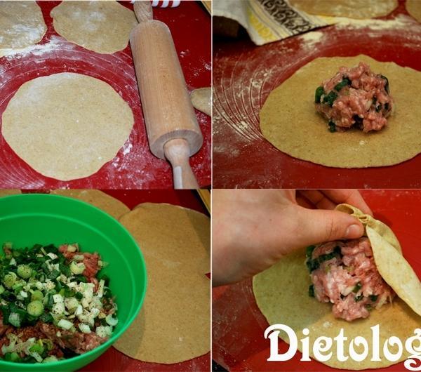 Składniki na 16 sztuk :Ciasto:500g mąki pszennej pełnoziarnistej200ml wody1 płaska łyżeczka soli1 jajkoFarsz:1 kg mielonego mięsa (ma być tłuste, ja użyłam łopatki wieprzowej. W Masz Gulasz jedliśmy wieprzowo- jagnięce)2 cebulki posiekane (użyłam całych ze szczypiorem, prosto z ogródka mojego tatusia)pęczek kolendry (jeśli nie ma świeżej, można zmielić taką z torebki)250 ml rosołku (teoretycznie powinien być świeży, ale ja gotowałam dzień wcześniej rosół i mi został, więc go użyłam, z powodzeniem)sól, pieprz do smakuświeżo mielony pieprz do podania