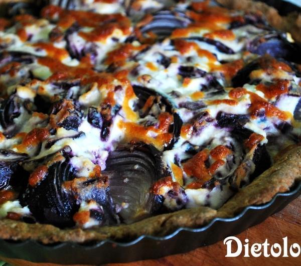 TARTA z CZERWONEJ CEBULISkładniki na 4 porcje :Ciasto:250g mąki pszennej pełnoziarnistej1 jajko2 łyżki śmietany 12%sól do smakuFarsz:5 czerwonych cebul1 łyżka oleju rzepakowego100g ricotty albo 3 łyżki śmietany½ opakowania mozzarelliZ mąki, jajka, śmietany i soli zagnieść ciasto, rozwałkować na grubość ok. 1,5cm, wyłożyć na formę delikatnie wysmarowaną masłem.Cebule obrać, jedną pokroić w drobną kostkę i przesmażyć na łyżce oleju. Dodać ricottę lub śmietanę i doprawić solą. Pozostałe cebule pokroić w ćwiartki i ułożyć na cieście tworząc rozetę. Zalać wierzch mieszanką śmietanowo-cebulową i posypać startą mozzarellą.Wstawić do piekarnika nagrzanego do temperatury 180 º C na około 40 minut.