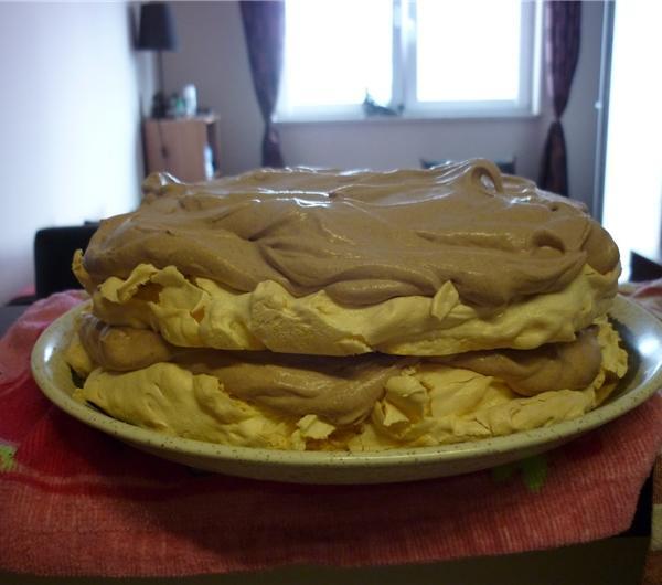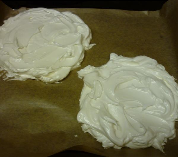bezową masę na blachę (mniej więcej 18cm krążki) i wciskam do pieca na 1,5h (moja uwaga jest następująca: po pewnym czasie 120st. to za dużo i jakby ciasto miało siedzieć całe 1,5h, to Wasza