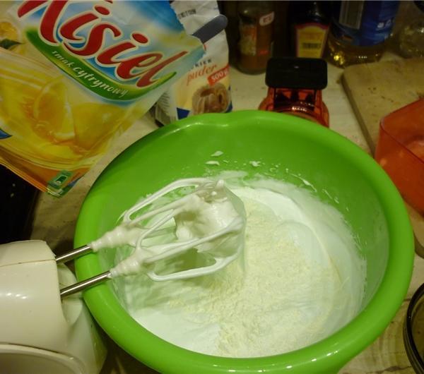 sok z limonki (wlało mi się dużo więcej, niż łyżeczka - tak ze trzy co najmniej ;p ) i dalej ubijam. Kiedy piana jest dość sztywna wrzucam