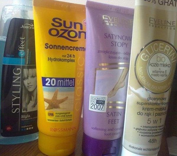 jedwabiste, moje WOW...;)Nie kosztowaĹ mnie wiele,bo jakieĹ 6 zĹ. Satynowy zaĹ do stĂłp, okoĹo 8 zĹ.Sun Ozon - krem do opalania z filtrem 20. DostÄpny w Rossmannie, nie kosztowaĹ nawet 10 zĹ. Testowany przez ostatnie parÄ dni. W prawdzie nie przebywaĹam na sĹoĹcu kilka godzin bez przerwy, ale myĹlÄ, Ĺźe zdaĹ egzamin. Przy czÄstym stosowaniu nie zauwaĹźyĹam, aby moja skĂłra byĹa podraĹźniona.No i... Joanna, MgieĹka stylizujÄ