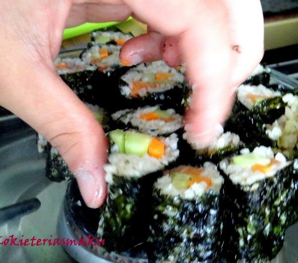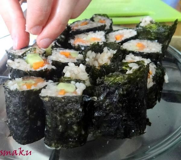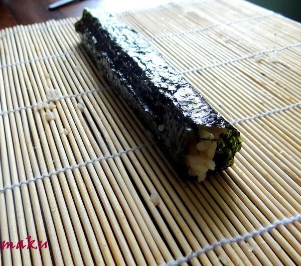 bambusową matą następnie kroimy na nie duże kawałki.Gotowe sushi maczamy w wasabi lub
