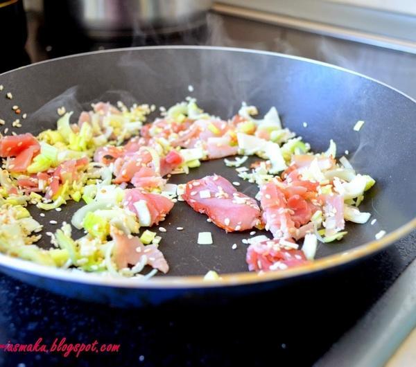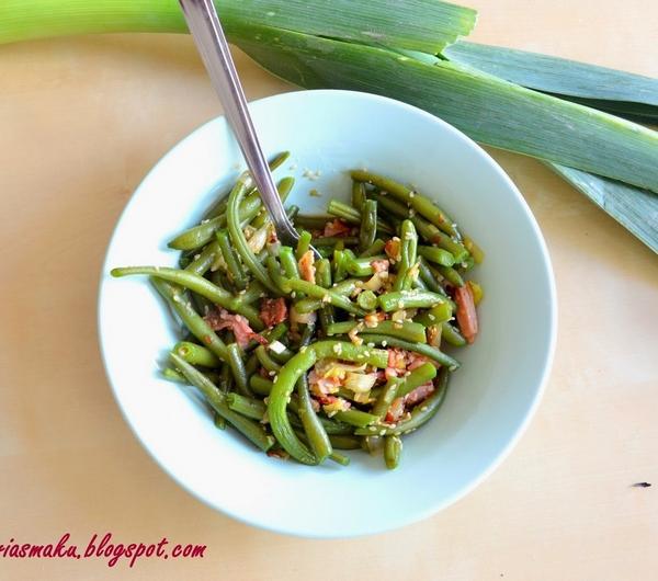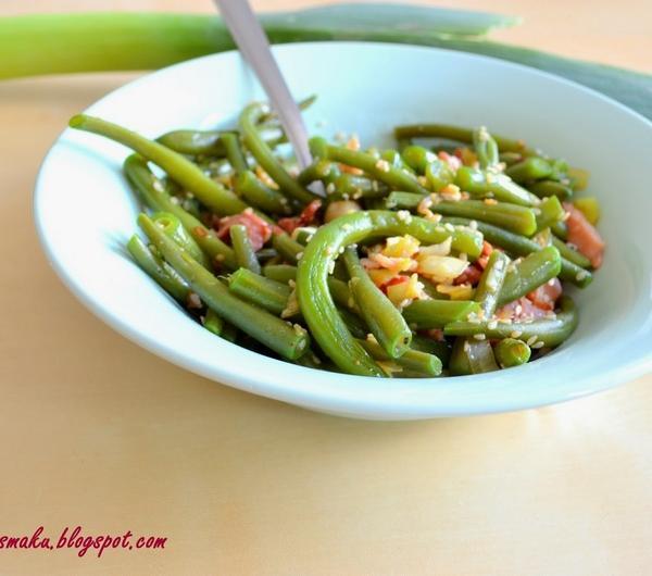 Potrzebne produkty:350 g fasolki szparagowej (zielonej)100 g szynki parmeńskiej60 g pora2 ząbki czosnku1/2 łyżeczki rozmarynu1 łyżka oliwy z orzeszków ziemnych4 łyżki sezamuświeżo zmielona sól i pieprzWykonanie:Fasolkę ugotować w osolonej wodzie ale tak żeby było lekko twarda.Na patelnie wlać łyżkę oleju z orzeszków ziemnych dodać sezam, drobno pokrojony czosnek, por i szynkę parmeńską.Podsmażyć tak by wszystko się zarumieniło i por był miękki.Na patelnie przesypać ugotowaną fasolkę i wszystko dokładnie wymieszać i posypać świeżo zmielonym pieprzem.* Porcja na dwie osoby. Jeśli ktoś lubi bardzo dobrze smakuje z pokrojonym na drobno serem kozim w ostrej panierce. Można jeść na ciepło i na zimno.