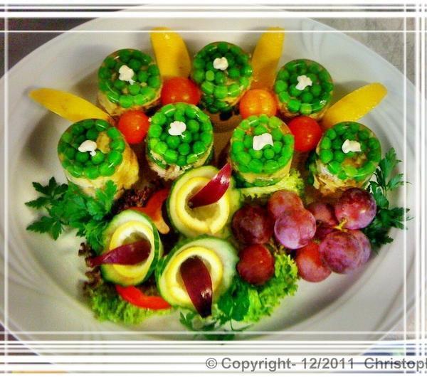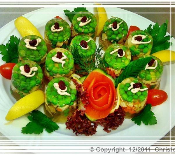 Kurczaka umyć, podzielić na części. Włożyć do garnka, zalać wodą i zagotować. Dodać oczyszczone i umyte warzywa ( włoszczyznę), osolić i gotować na małym ogniu około 1 godzinę. Ugotowanego kurczaka ostudzić w wywarze ( rosole). Wyjąć, usunąć kości i skórę. Pokroić w kostkę. Z rosołu częściowo zdjąć powstały podczas gotowania tłuszcz. Rosół podgrzać, dodać 2 ubite białka i cały czas podgrzewając i mieszając trzepaczką ,sklarować.Po zagotowaniu, przecedzić przez sito wyłożone gazą. Jeszcze raz podgrzać i dodać namoczoną w wodzie żelatynę, ale już nie gotować. Przepis na ilości żelatyny potrzebny na 1 litr galarety znajduje się na opakowaniu żelatyny. W zależności od producenta jest różny.Do kubeczków nalać cienką warstwę galaretki. Poczekać aż zastygnie i ułożyć warstwę zielonego groszku. Ja używam zblanszowanego mrożonego groszku. Jego kolor jest naprawdę zielony. Ten z puszki jest mdły. Następnie ułożyć pokrojonego w kostkę kurczaka i zalać całość tężejącą galaretą.Odstawić w chłodne miejsce do całkowitego zastygnięcia.