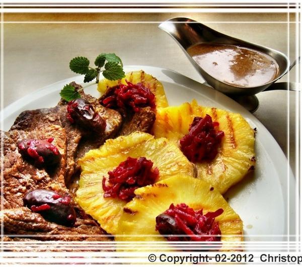 400g wołowiny ligawy(legawy)100ml wytrawnego wina Marsala4 łyżki oleju+ masło0,5 cebuli3łyżki mąki200ml bulionu warzywnegosól, pieprz, cukierświeży ananasburaczki tarte, ugotowane, doprawioneLigawę pokroić w plastry, rozbić, posypać solą, pieprzem i oprószyć mąką.Obsmażyć na dobrze rozgrzanym tłuszczu, dorzucając cebulkę.Wlać wino, smażyć 1 min., podlać 3łyżkami bulionu, smażyć do odparowania.Wlać resztę bulionu, zmniejszyć ogień i dusić bitki, aż będą miękkie.Grillować plastry świeżego ananasa.Serwować bitki z plastrami grillowanego ananasa z dodatkiem buraczków.Bardzo dobrze komponują się moje pyzy poznańskie (pampuchy jak mówią inni) gotowane w wodzie, polane sosem tym sosem.