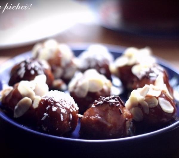 cukier waniliowy (dodaje efekt chrupania) i wszystko dokładnie mieszamy tak aby powstała masa (na początku może wydawać się zbyt sucha - nic bardziej mylnego) i wszystko upychamy dokładnie do jakiegoś pudełka (np. po lodach, masełku itp.). Masę zostawiamy w lodówce na noc. Następnego dnia wyciągamy masę i kształtujemy je w kuleczki (lub inne ciekawe kształty). Gdyby jednak okazało się, że masa nie klei się, można spokojnie dodać odrobinę