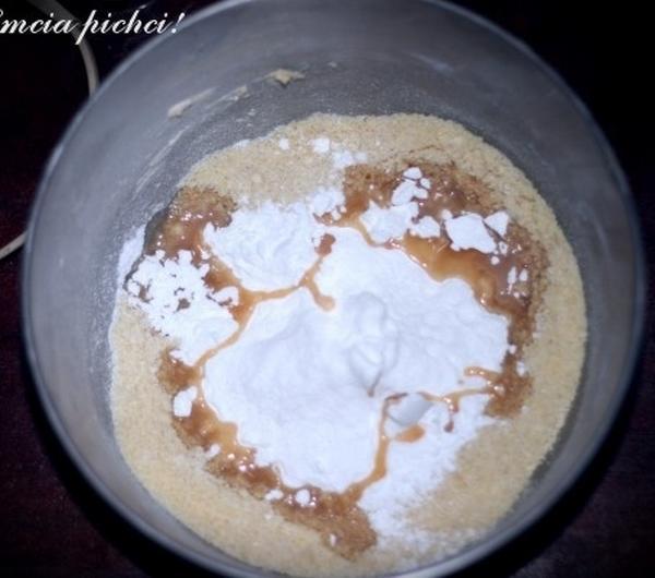 Migdały mielimy na mączkę (ja użyłam blendera), do gotowego "puchu" dodajemy