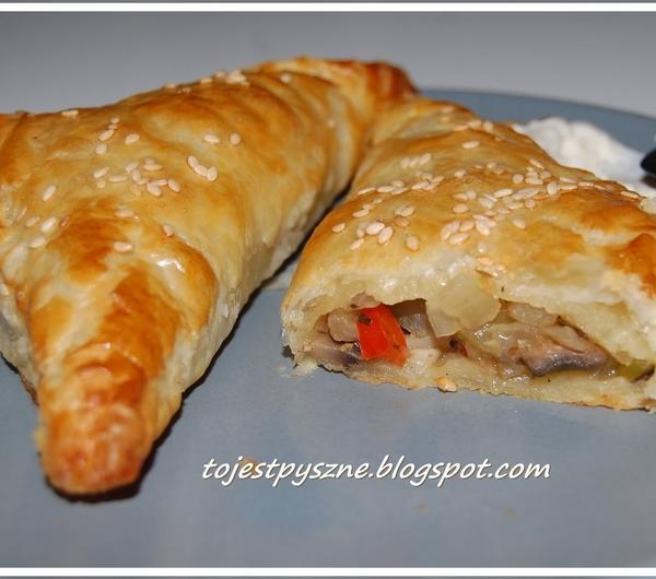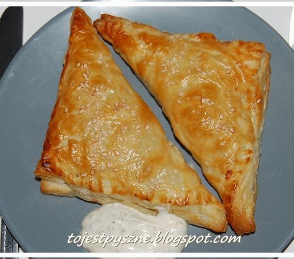 Ciasto francuskie rozkładamy i kroimy na kwadraty wielkości ok. 10 cm na 10 cm. Układamy po łyżce farszu i ciasto składamy w po przekątnej na pół, aby powstały trójkąty. Delikatnie sklejamy boki. Na koniec widelcem delikatnie dociskamy boki. Smarujemy pędzelkiem wierch rozbełtanym