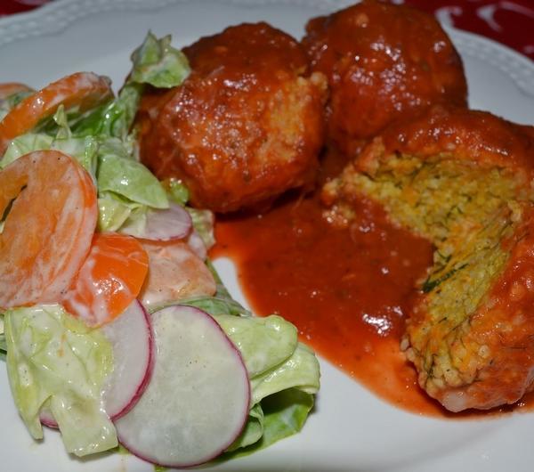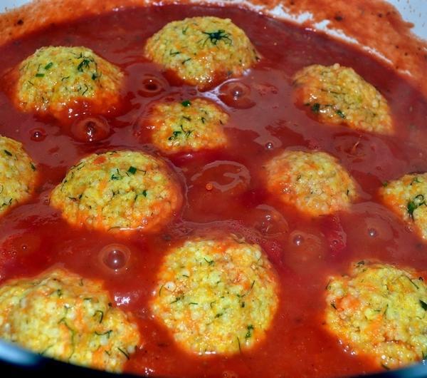 Składniki:- 1 kubek kaszy jaglanej- 2 marchewki- 1 pietruszka- 2 łyżki mielonego siemienia lnianego- 2 łyżki oliwy- pół pęczka koperku- majeranek, curry, papryka ostra, sól, pieprzSos pomidorowy:- pasta pomidorowa około 500 ml- 200 g dyni (można pominąć)- czosnek- majeranek- oregano, bazyliaKaszę płuczemy na sitku pod bieżącą wodą. Następnie wlewamy do garnka 2 kubki wody na 1 kubek kaszy. Odrobinę solimy. Tak gotujemy kaszę przez około 7 minut na średnim ogniu, następnie wyłączamy gaz, przykrywamy i pozostawiamy jeszcze na około 10 min. Kasza wchłonie całą wodę i będzie sypka.Marchewkę i pietruszkę ścieramy na drobnych oczkach tarki. Do starkowanych warzyw dodajemy kaszę, siemie, oliwę i zioła. Całość wyrabiamy na jednolitą masę. Masa musi być klejąca.Zwilżamy dłoń w zimnej wodzie i formujemy małe klopsiki wielkości orzecha włoskiego.Przygotowanie sosu: Pastę pomidorową wlewamy do garnka, dodajemy zioła, przyprawy i czosnek - gotujemy około 5 min aż smaki się połączą. Jeśli dodajemy dynię, proponuję wcześniej ją ugotować (najlepiej na parze). Ugotowaną dynię dodajemy do pasty pomidorowej. Jeśli dynia jest bardzo miękka sama się rozpadnie pod wpływem ciepła i mieszania.Do sosu dodajemy klopsiki jaglane, przykrywamy i gotujemy na wolnym ogniu około 10-15 minut.Podajemy z sałatami, mięsem lub jako samodzielne danie!SMACZNEGO!!!