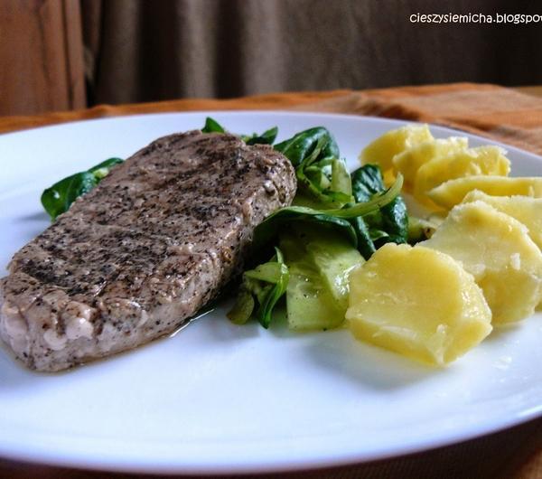 pieprzem. Smażymy z obu stron ok. 2 min po każdej z nich na patelni (ja użyłam grillowej) lub na grillu. Uwaga, żeby nie przesmażyć bo
