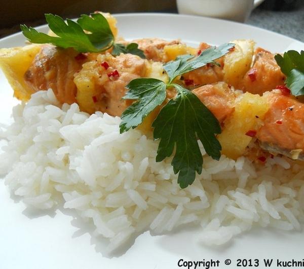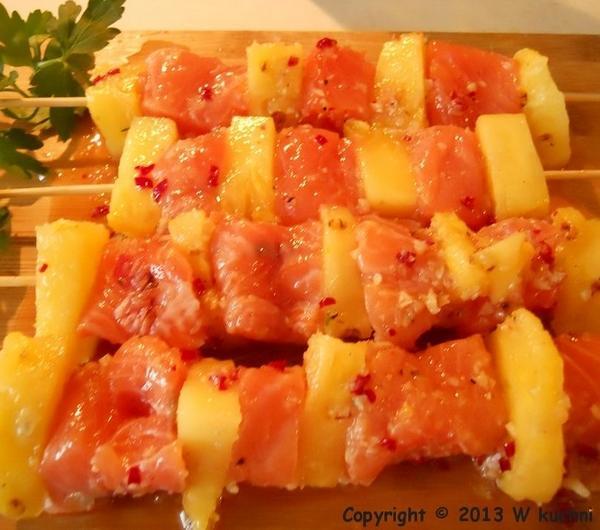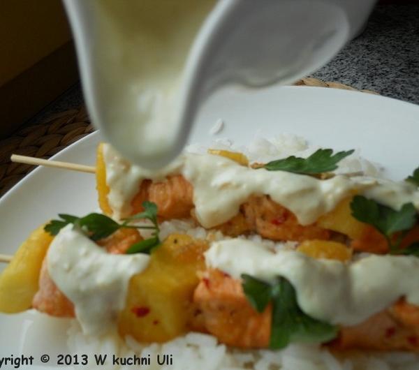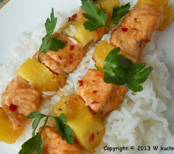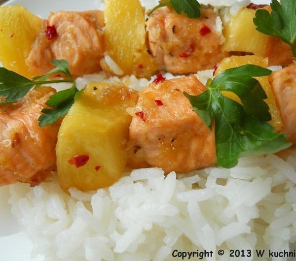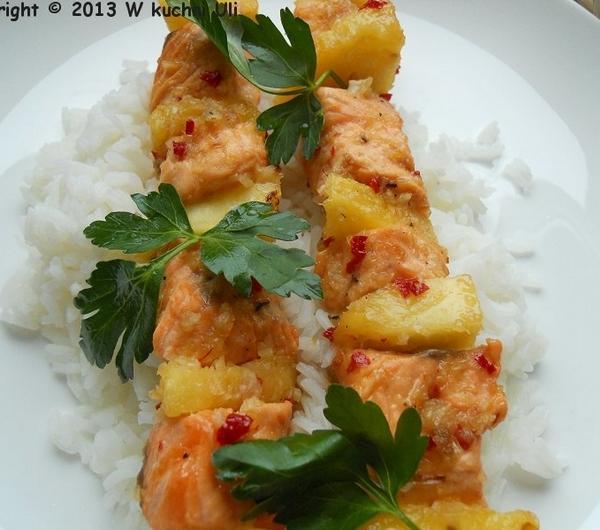 składniki:300 g filetów z łososiamały świeży obrany ananasświeża natka pietruszkiglazura:3 ząbki czosnku w łupinkach1 mała cebulka szalotka2 łyżeczki posiekanej papryczki chilli bez pestek30 ml białego octu winnego2 łyżki brązowego cukru1/2 łyżeczki solisos:100 g śmietany 18 %1/2 cytrynyprzygotowanie: z kawałka łososia usunęłam skórę, mięso umyłam i osuszyłam papierowym ręcznikiem, pokroiłam na mniejsze kawałki. ananasa obrałam i też pokroiłam na mniejsze kawałki. nadziałam na patyki do szaszłyków na przemian łososia i kawał ki ananasa.czosnek w łupinkach i cebulę w łupinie przekrojoną na pół opiekłam na płytce na palniku aż się zrumieniła. następnie obrałam czosnek i cebulę wrzuciłam do blendera, dodałam papryczkę chilli, ocet, cukier oraz sól i zmiksowałam. ( wyszło bardzo ostro, ale tak musi być :) )przygotowane szaszłyki posmarowałam dobrze glazurą i odstawiłam na jakieś 15 - 20 minut. następnie grillowałam je na patelni grillowej ok. 3 - 4 minuty z każdej strony, aż łosoś ładnie się zarumienił.śmietanę wymieszałam z sokiem z cytryny oraz startą skórką z jednej małej cytryny.gotowe szaszłyki podałam z ryżem jaśminowym, posypane listkami świeżej pietruszki oraz przygotowaną śmietaną cytrynową.całość smakowała bosko! danie bardzo lekkie, a przepis zaczerpnęłam stąd ( kilk ) .