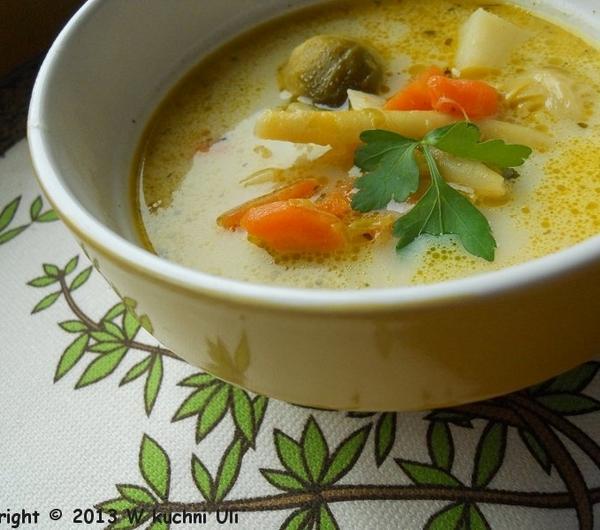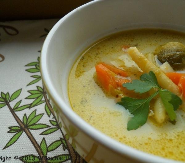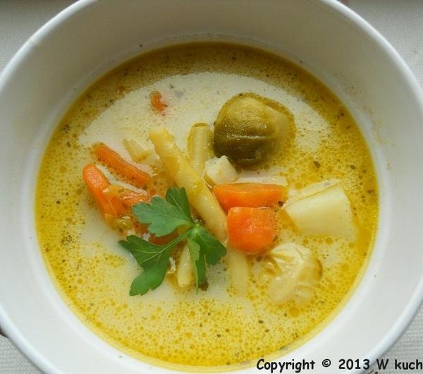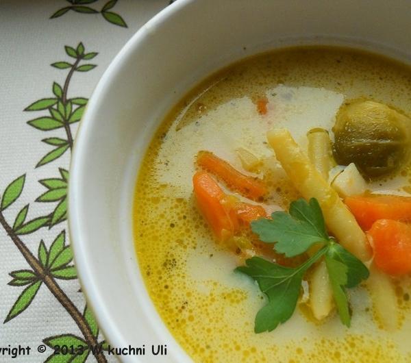 składniki:1,5 l wody3 małe marchewki1 średnia pietruszkapół małego selera12 brukselekdwie garście mrożonej fasolki szparagowej żółtej1 łyżka masła1,5 - 2 łyżki oliwy extra ver gin2 kostki warzywneszczypta suszonego lubczyku1 mały listek laurowy1 ziarenko ziela angielskiego2 - 3 ziarenka pieprzukilka gałązek świeżej natki pietruszkimały kawałek pora2 malutkie cebulki szalotki1 malutki ząbek czosnku1 ziemniak1 - 1,5 łyżki śmietany do zupy 18 %przygotowanie:obraną, umytą marchewkę i pietruszkę pokroiłam na drobne kawałki i wrzuciłam do garnka, dodałam obrane brukselki, cebulki, czosnek, fasolkę szparagową, lubczyk, oliwę, masło i pod smażyłam mieszając ok. 10 minut, następnie zalałam wodą, dodałam natkę pietruszki, por, obrany i pokrojony na mniejsze części seler, kostki warzywne, ziarenka pieprzu i ziela angielskiego oraz listek laurowy i całość gotowałam na wolnym ogniu do momentu aż warzywa stały się miękkie. pod koniec dodałam ziemniaka pokrojonego na małe części.widelcem wyłowiłam pora, nać pietruszki, oraz kawałki selera. doprawiłam do smaku solą i pieprzem. śmietanę zahartowałam wywarem, dodałam do całości i chwilkę pogotowałam bez doprowadzania do zagotowania.gotową zupę posypałam posiekaną natką zielonej pietruszki.