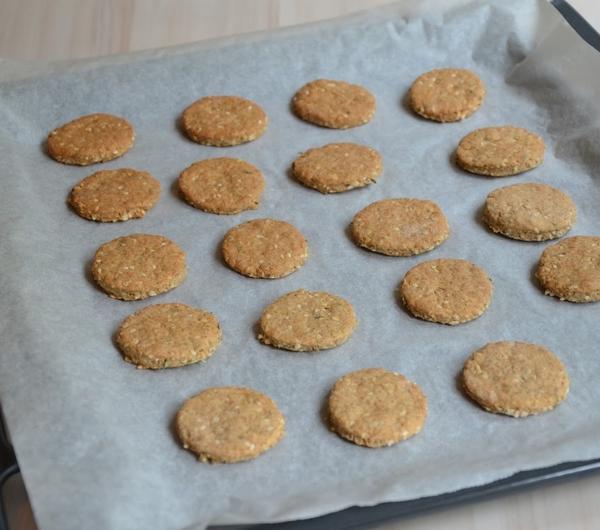 mąką i cienko rozwałkować ciasto.5) Wycinać z niego kółka i układać na dwóch blachach wyłożonych papierem do pieczenia.6) Piec w temperaturze 190 st. C przez 10-15 minut, aż będą lekko brązowe.Przepis stąd .Czas przygotowania: 40 minutLiczba sztuk: 53Kaloryczność jednej sztuki: 30 kcal