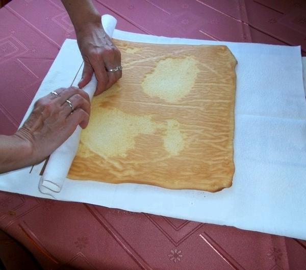 Biszkopt razem ze ściereczką zwijamy w rulon.